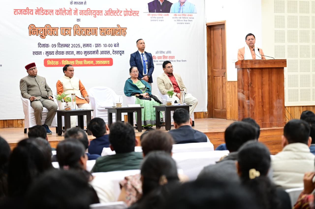 DEHRADUN: मुख्यमंत्री पुष्कर सिंह धामी ने मंगलवार को मुख्य सेवक सदन, मुख्यमंत्री आवास, देहरादून में आयोजित कार्यक्रम में प्रतिभाग करते हुए चिकित्सा सेवा चयन बोर्ड के माध्यम से चयनित राजकीय मेडिकल कॉलेजों में 142 असिस्टेंट प्रोफेसर्स को नियुक्ति पत्र वितरित किए।