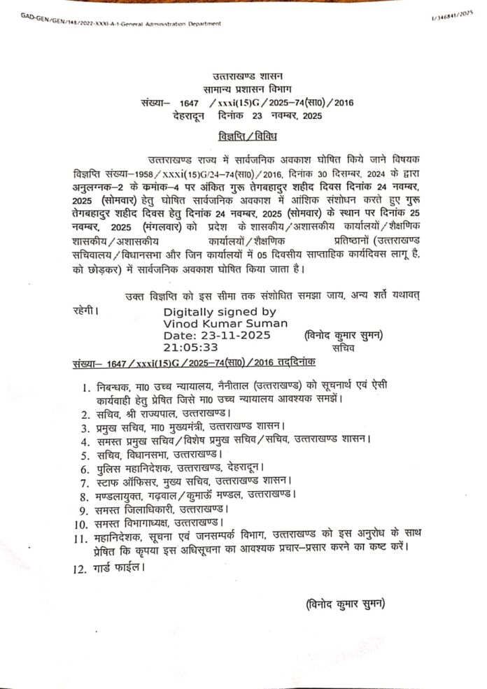 देहरादून: उत्तराखंड शासन ने गुरु तेगबहादुर शहीद दिवस पर घोषित सार्वजनिक अवकाश में संशोधन करते हुए इसकी तिथि बदल दी है। पहले यह अवकाश 24 नवंबर (सोमवार) को निर्धारित था, जिसे अब परिवर्तित करके 25 नवंबर 2025 (मंगलवार) कर दिया गया है।